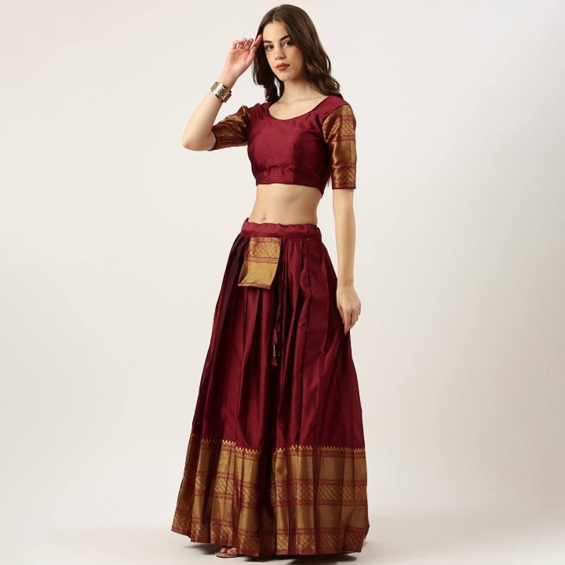 Lehenga Fabric : Art Silk Blouse Fabric : Art Silk Dupatta Fabric : Art Silk Lehenga Lining Fabric : Cotton Ornamentation : Zari Lehenga Closure :Drawstring Hemline : Flared Neck : Round Neck